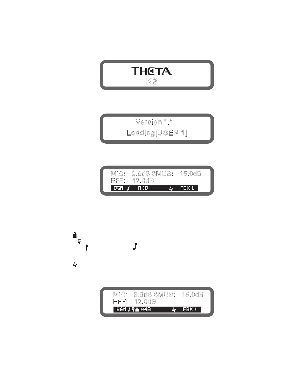 Feedback eliminator status ("FBX1-5" indicates feedback eliminate grade 1-5,