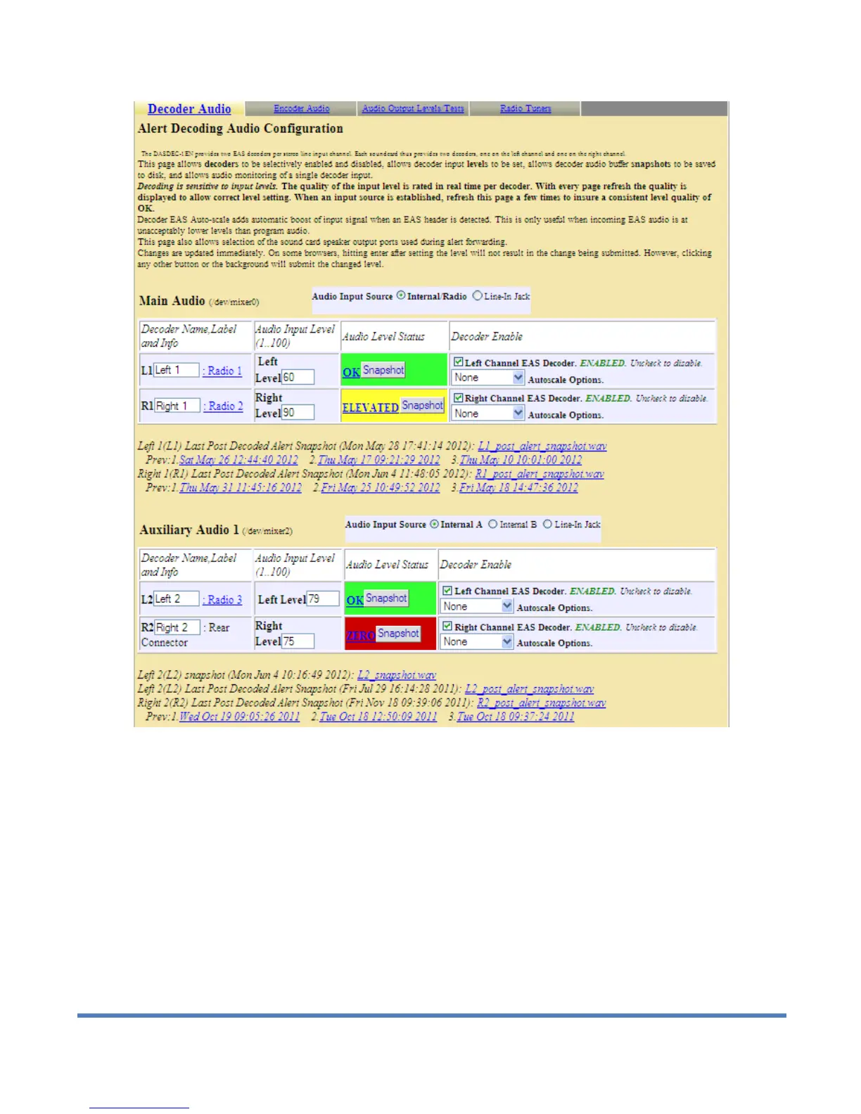 Alert Decoder configuration section for Setup > Audio > Decoder Audio, top half of web page