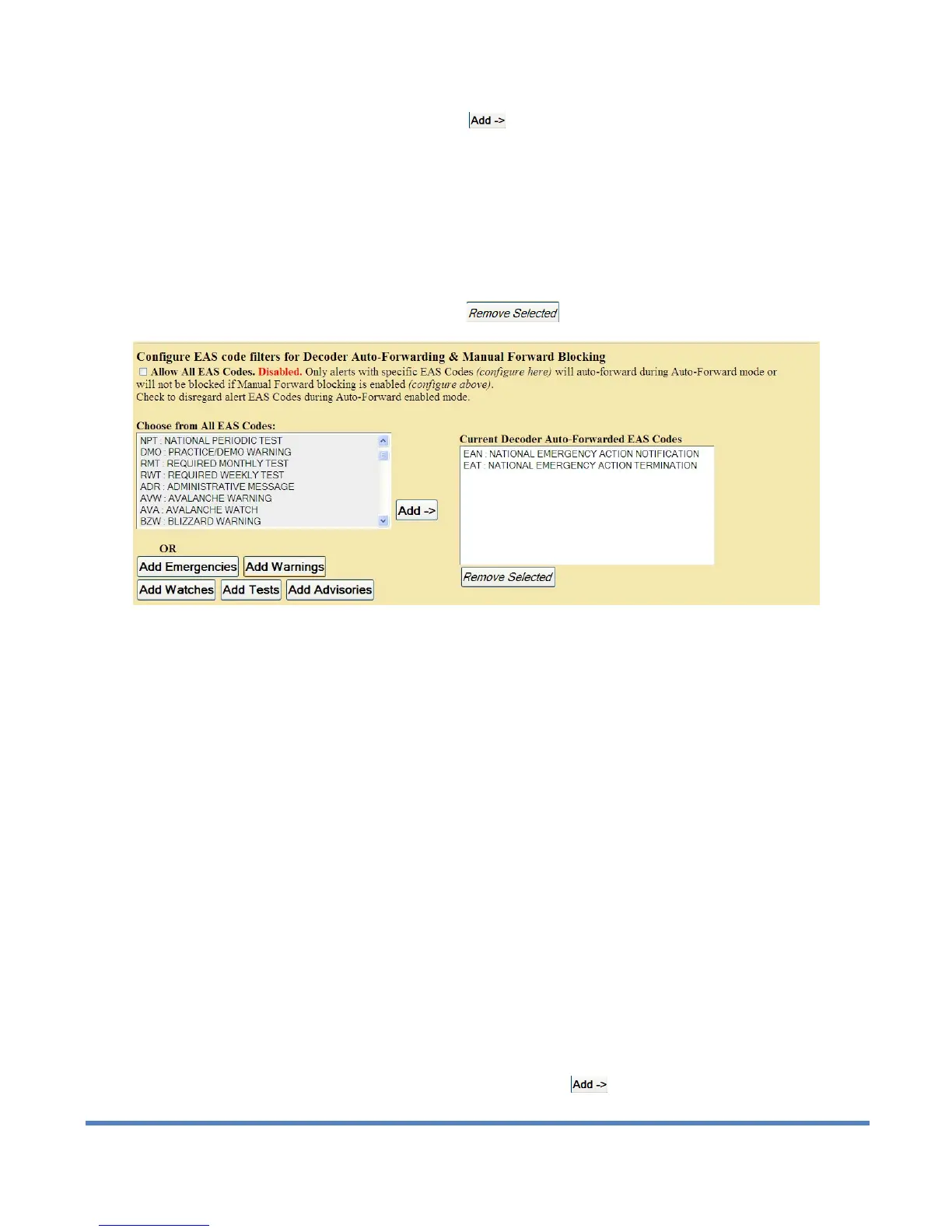 To remove codes from the auto-forward list, select each EAS code line in the Current Decoder Auto-