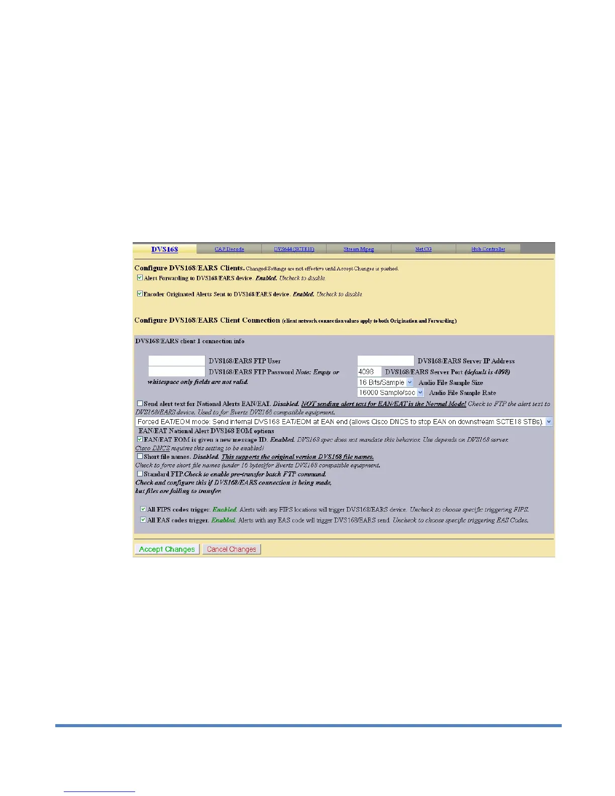 Remove the check mark from the box that says All FIPS codes trigger the DVS168/EARS device to enable