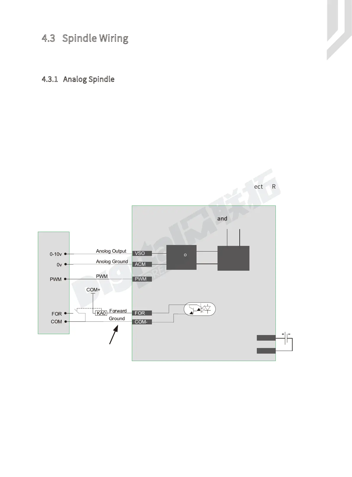 In Analog Spindle, the speed controlling output terminal can output 0-10V. It can adjust the