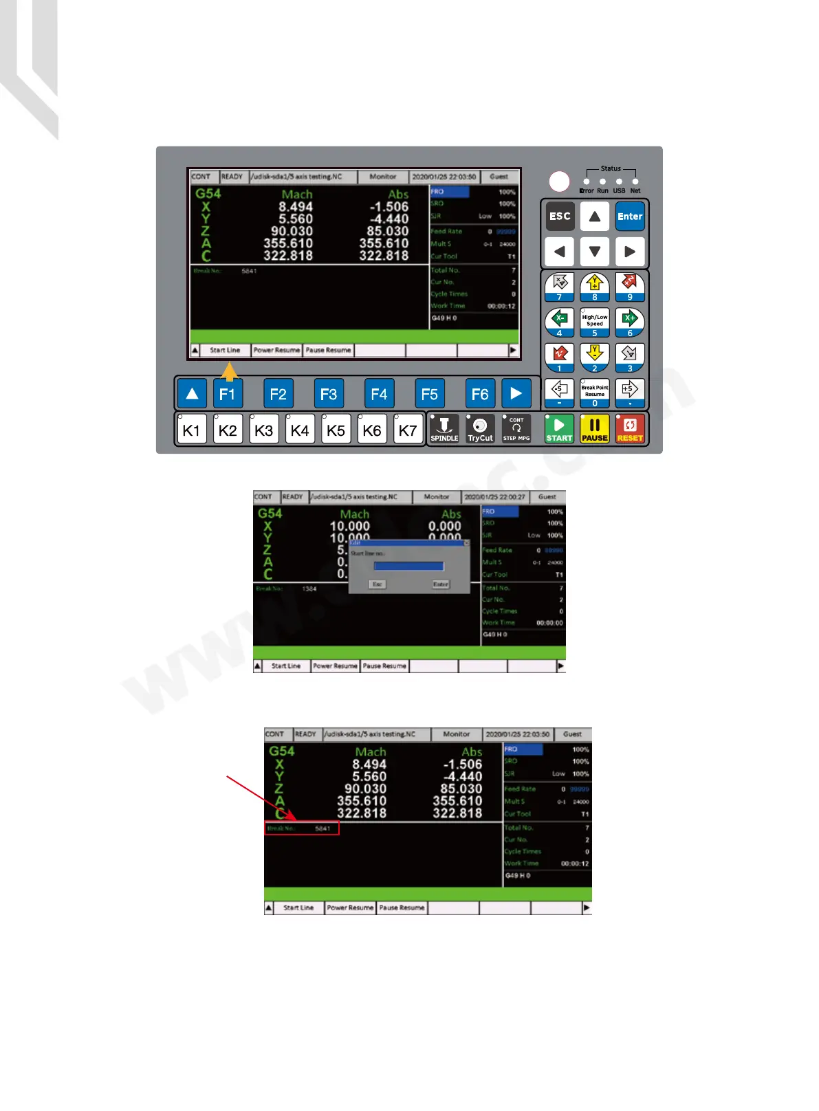 After power cut off or Pause, the controller can create a breakpoint number: