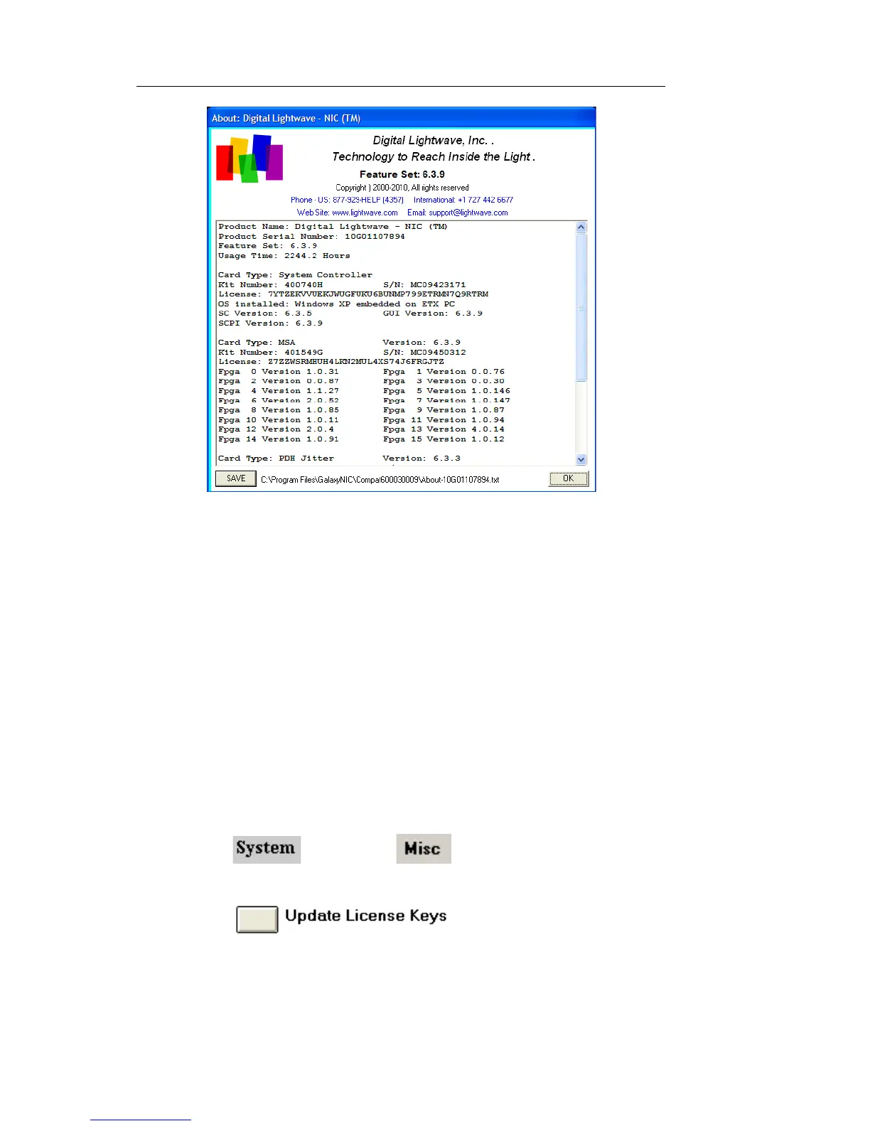 4. Select SAVE to save the About window information to a file.