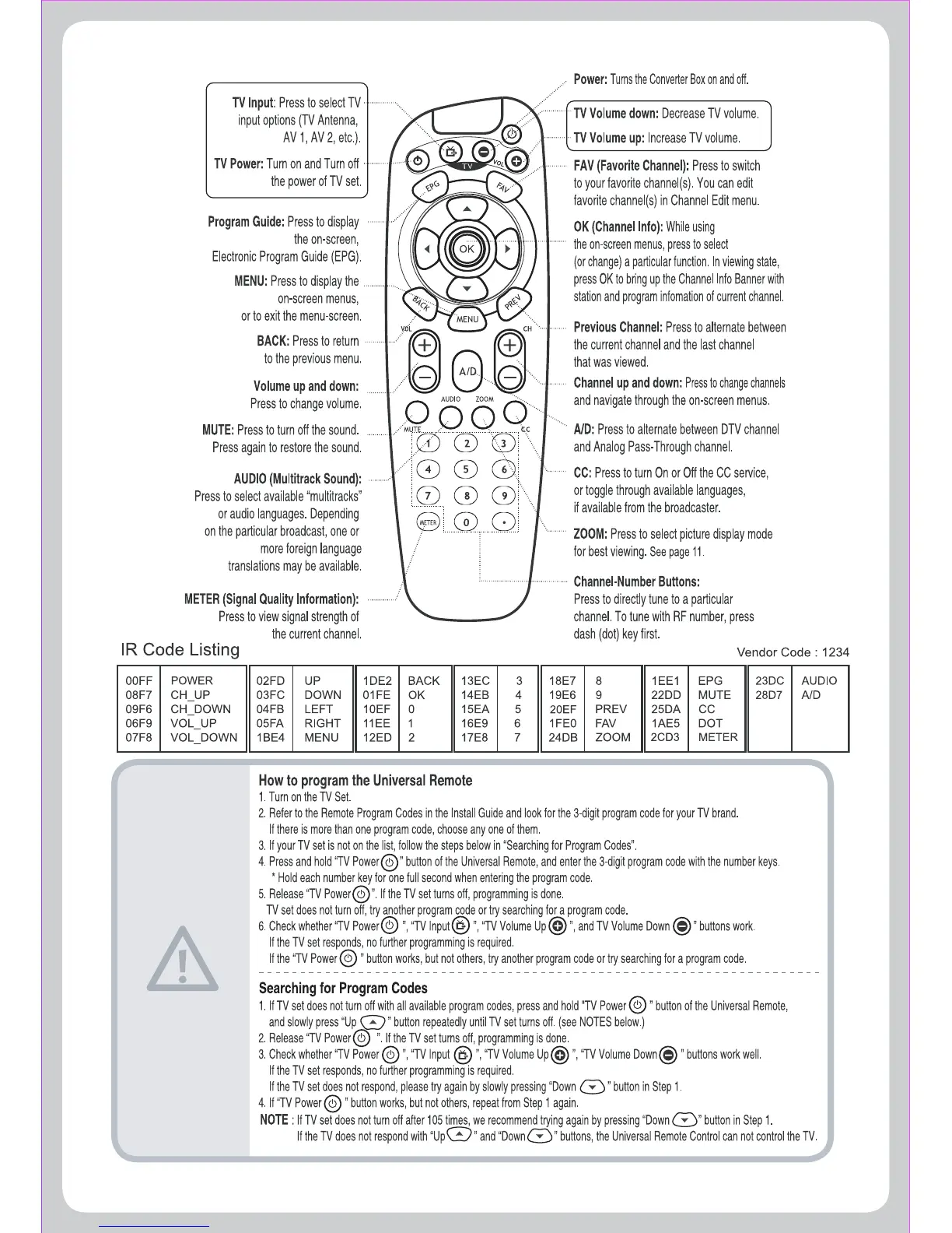 Digital Stream DTX9950 - Universal Remote Control Operation; Remote Control Button Functions; Programming the Universal Remote; Searching for Remote Control Codes