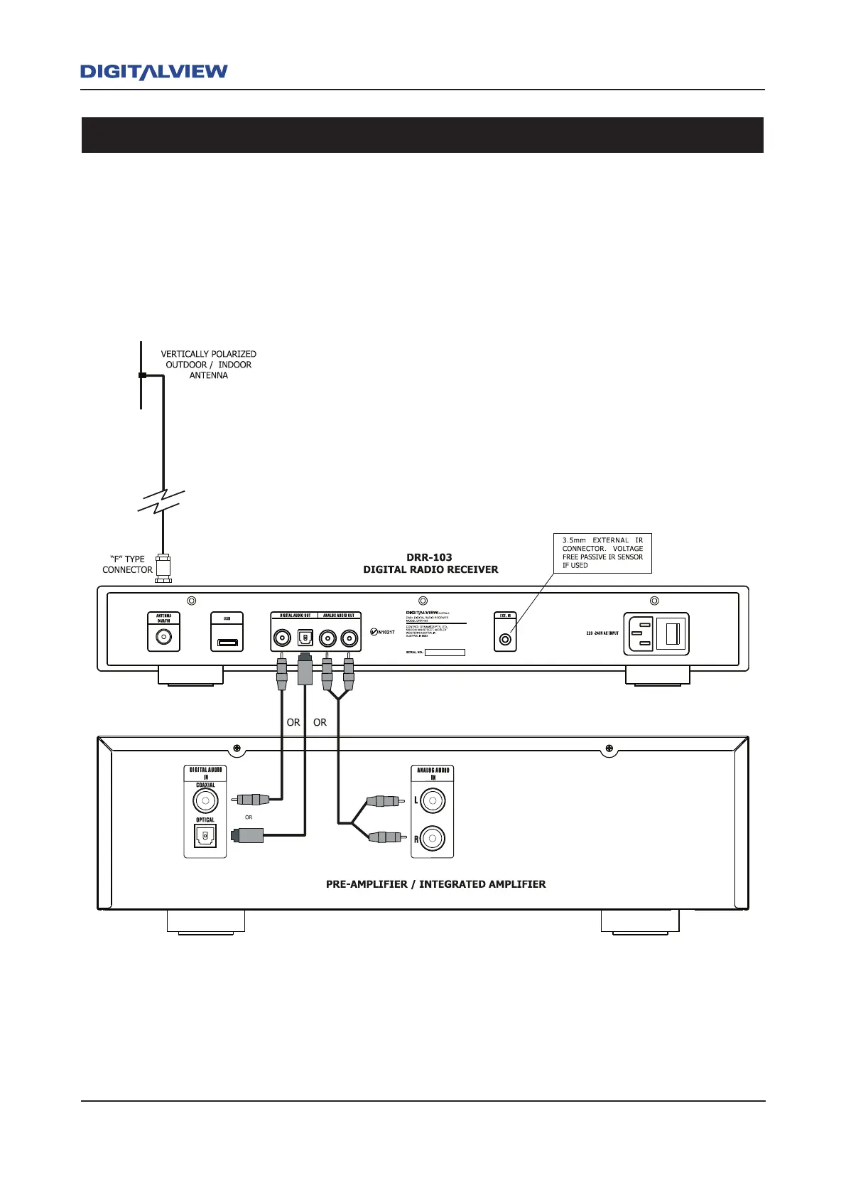 The connection diagram shows a typical pre-amplifer connected to the DRR-103. Use the digital