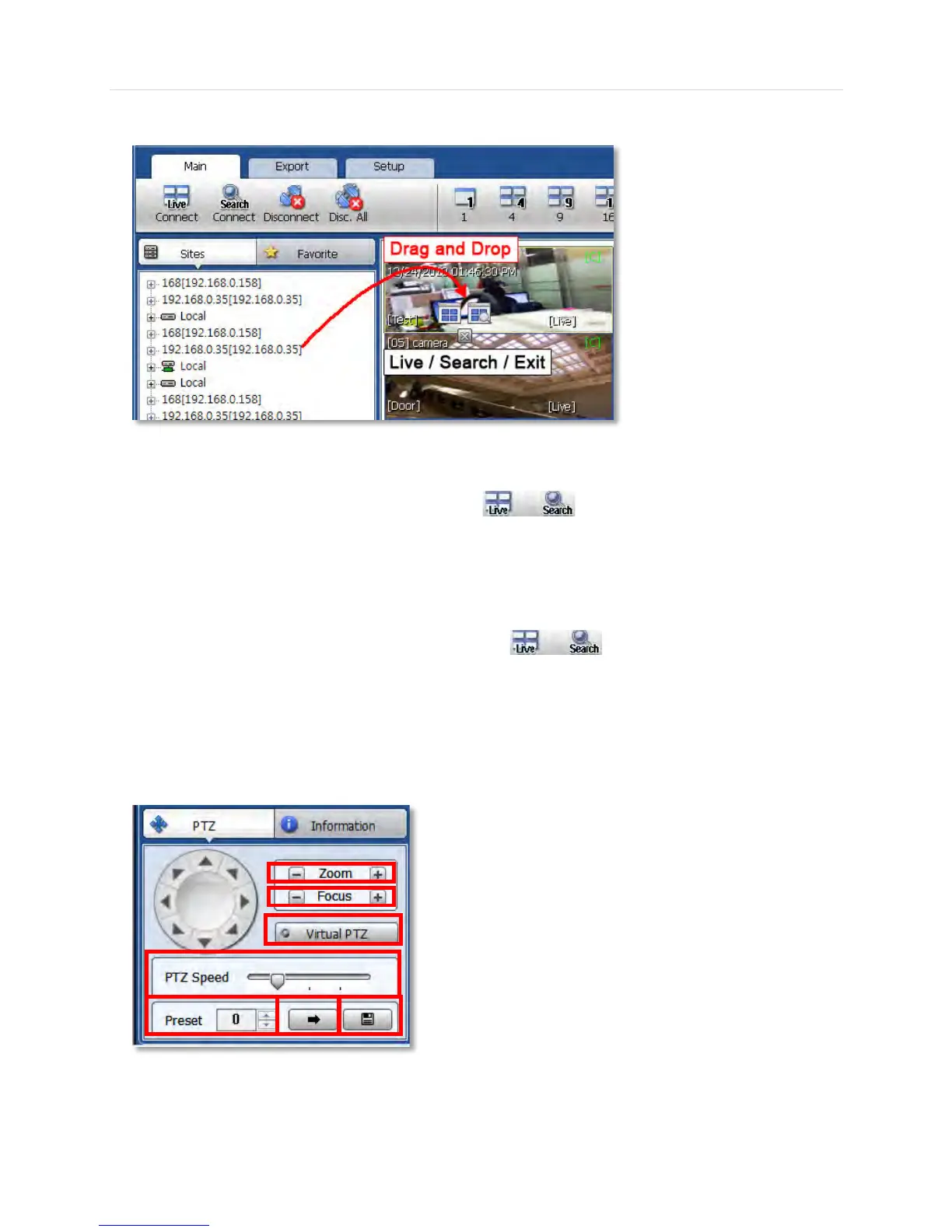 Any PTZ camera properly setup from the DVR can be controlled using the Pivot’s virtual joystick in Live mode.