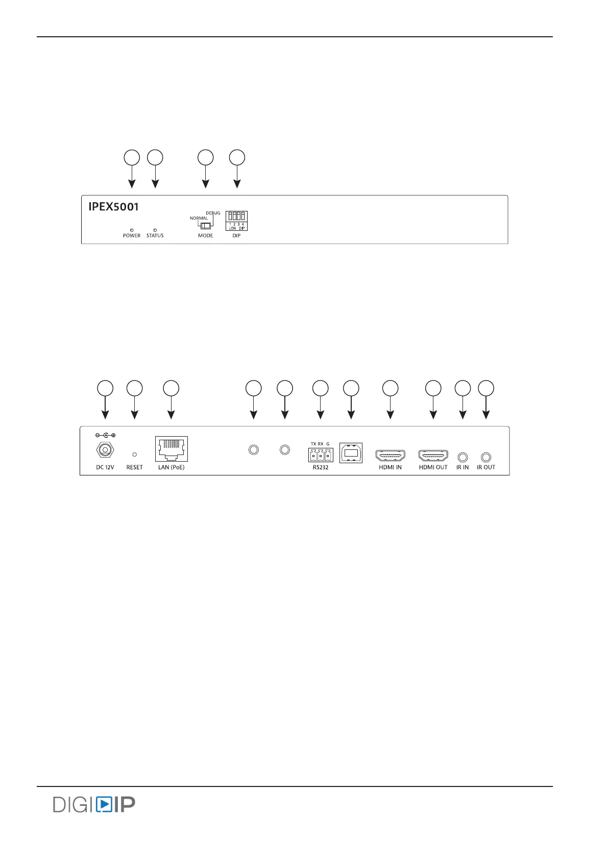 DigitaLinx IPEX5001-D - Front and Rear Panels; IPEX5001 Front Panel; IPEX5001 Rear Panel