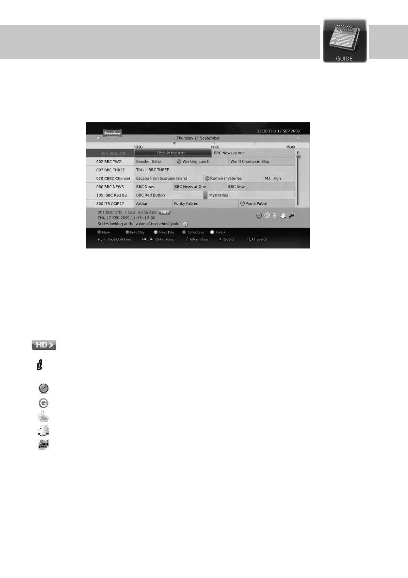 The programme guide displays a full list of available services and programmes based on the date and
