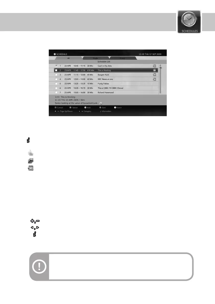 - RED: Cancel. Press the RED button to cancel a schedule.