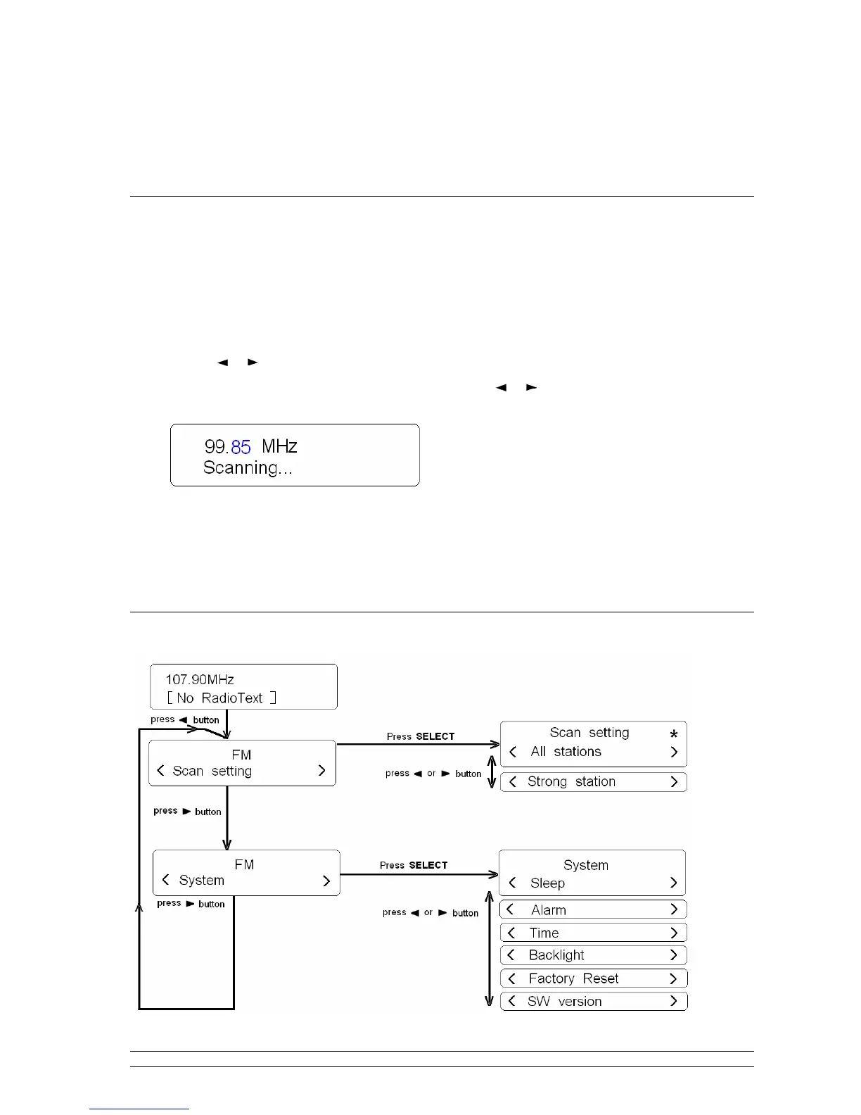 4. To automatically ‘SEEK’ active station, press and hold or button, or simply press the