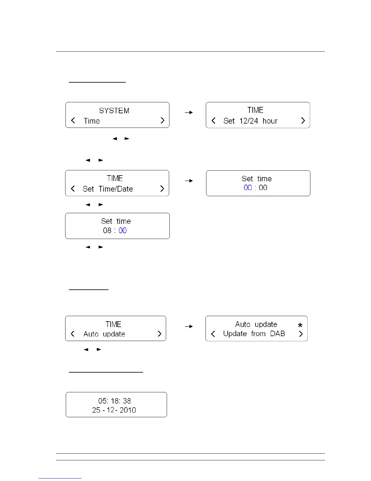 Note: here, press or , which you can browse <Set 12/24 hour format>, <Set Time/date>, <Auto update>,