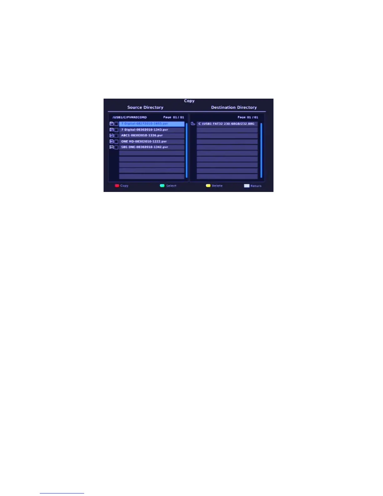 GREEN button to select the file/folder. Press YELLOW button to delete.