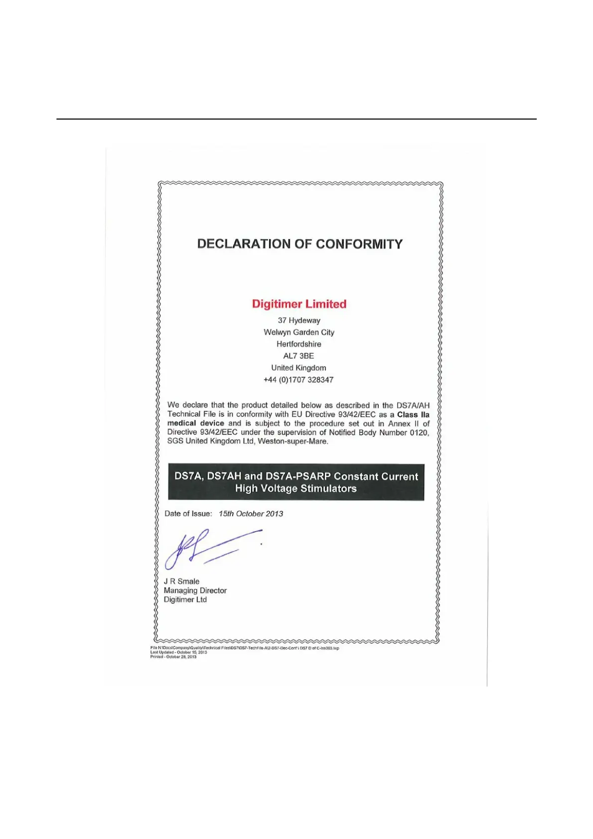 Digitimer DS7A - EU Declaration and FDA Indications; EU Declaration of Conformity