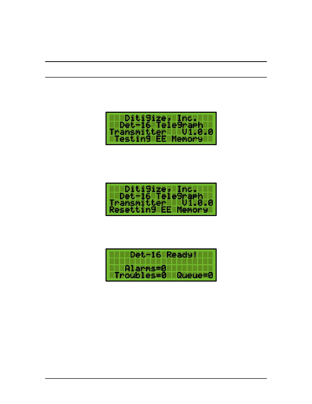 During power up, the DET-16 panel displays the following: