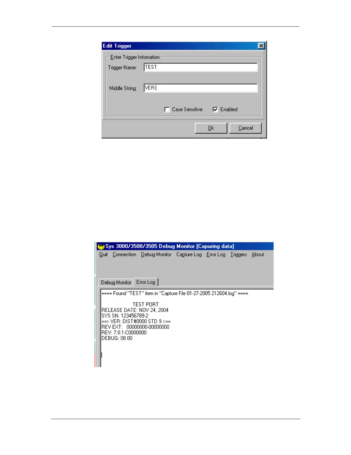 Debug Monitor program then captures 3 lines of text before the Trigger and 3 lines