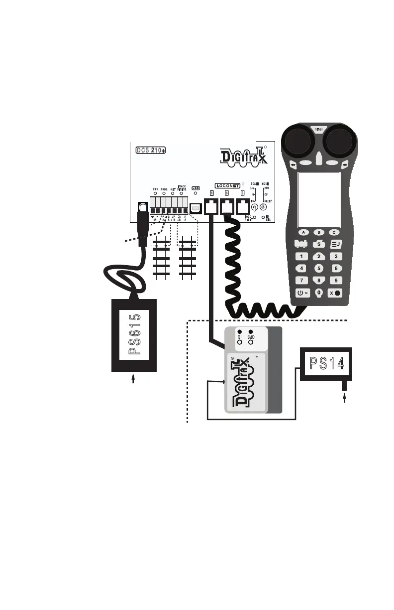 2. Connect a DT602/D throttle via a LocoNet RJ12 cable to any one of the