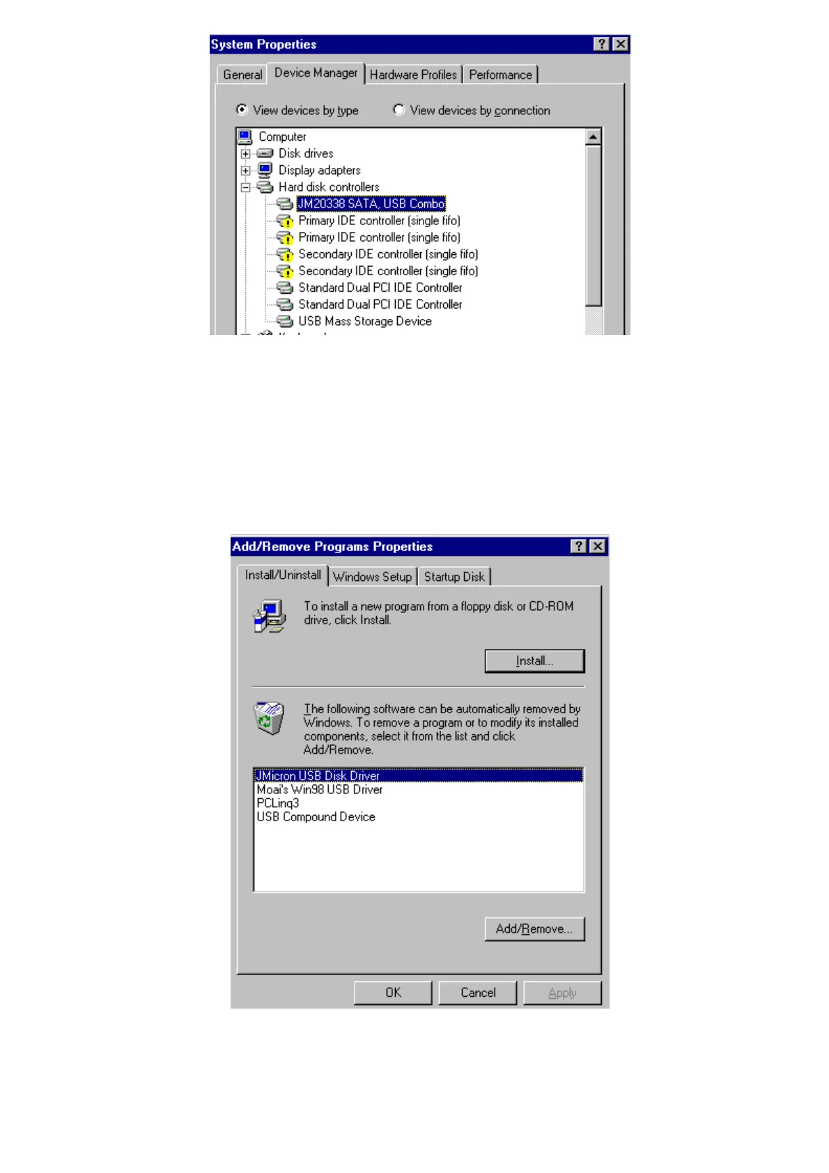 3) When the following screen displays, Please click ‘ JMicron USB Disk Driver’, and then click “ADD/Remove…”,