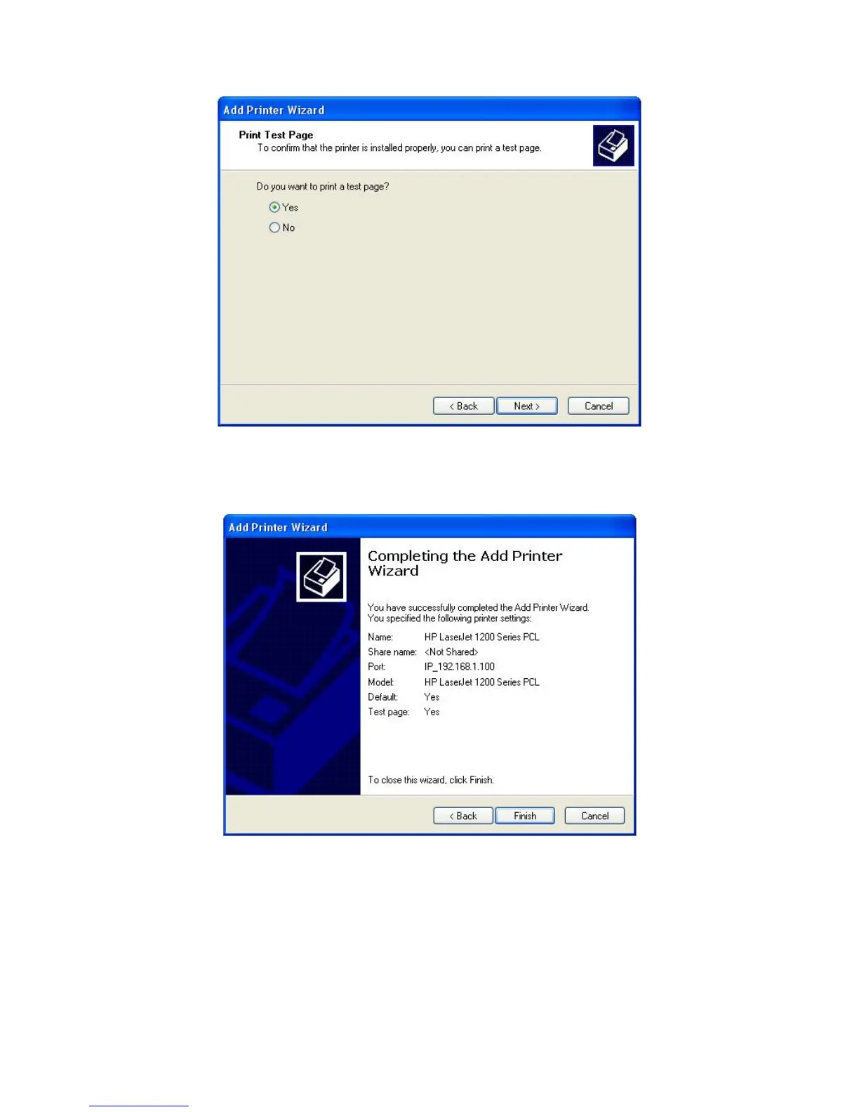 Select whether you want to print a test page or not. Here we select