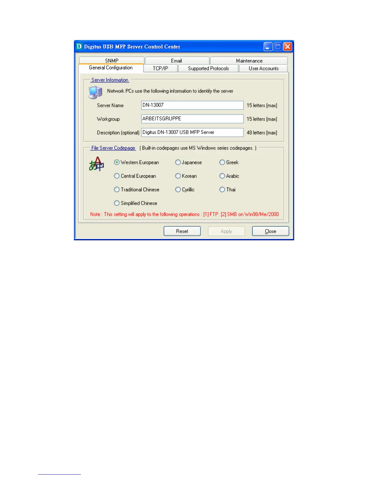 5. Select your codepage form File Server Codepage box and click Apply.