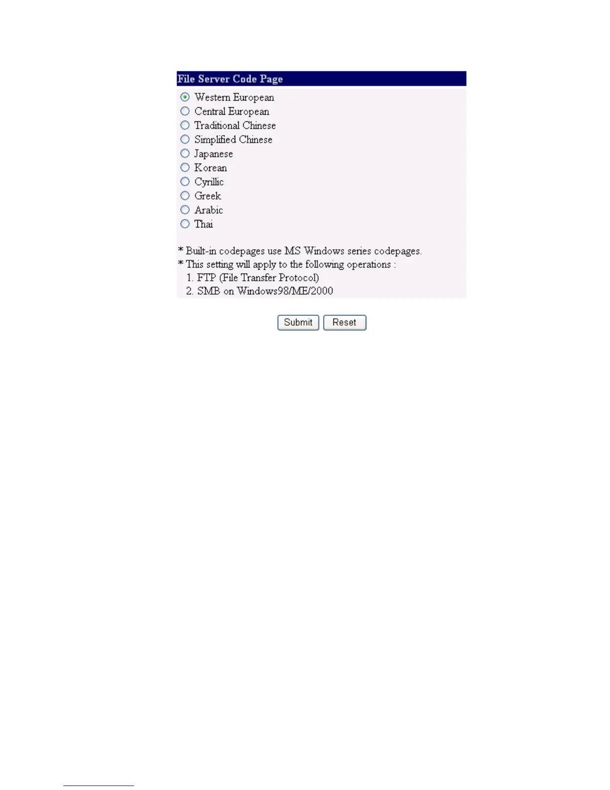 4. Select your codepage form File Server Codepage box and click Apply.
