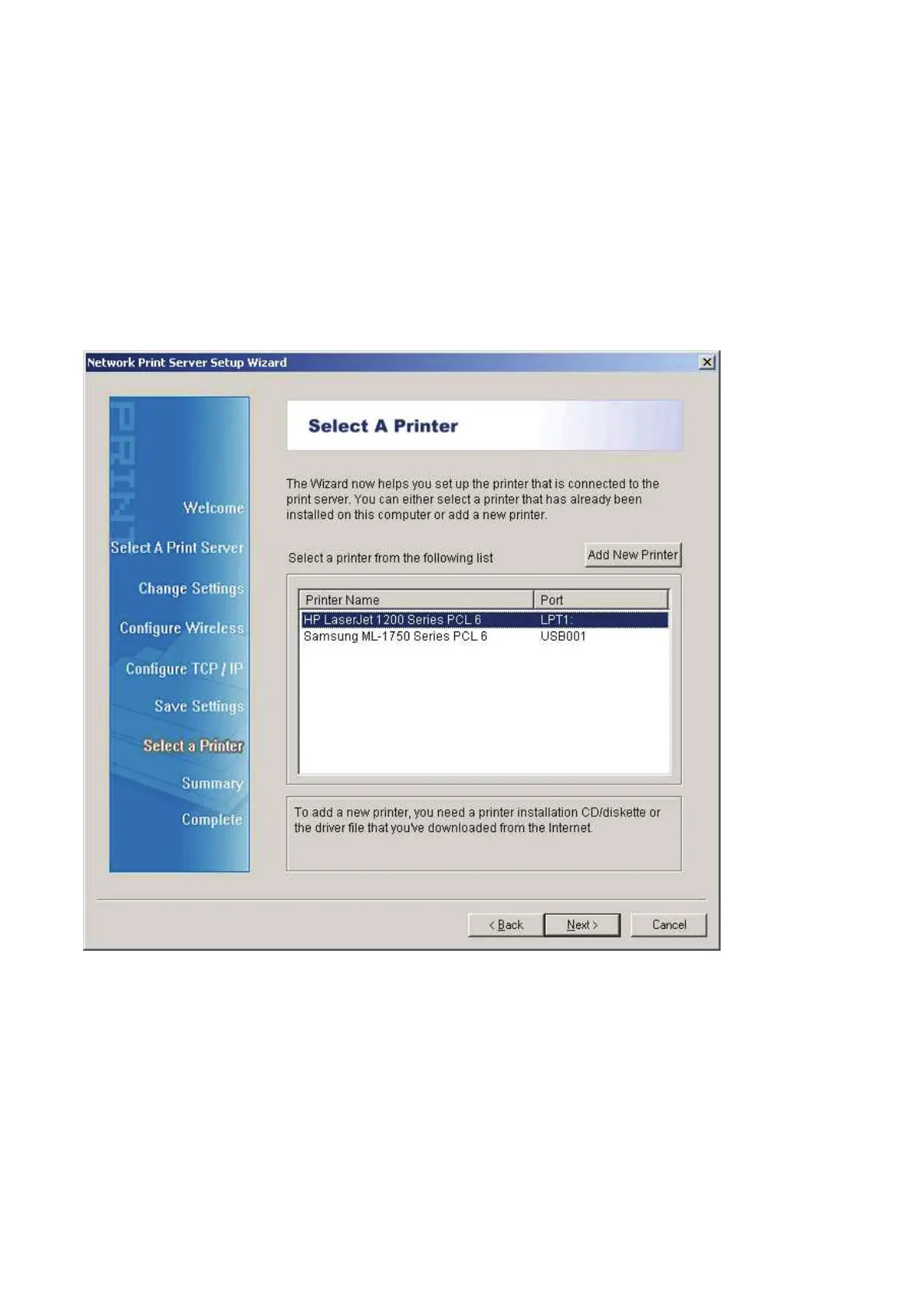 14. In the setup wizard, finish the installation by highlighting the installed printer in the