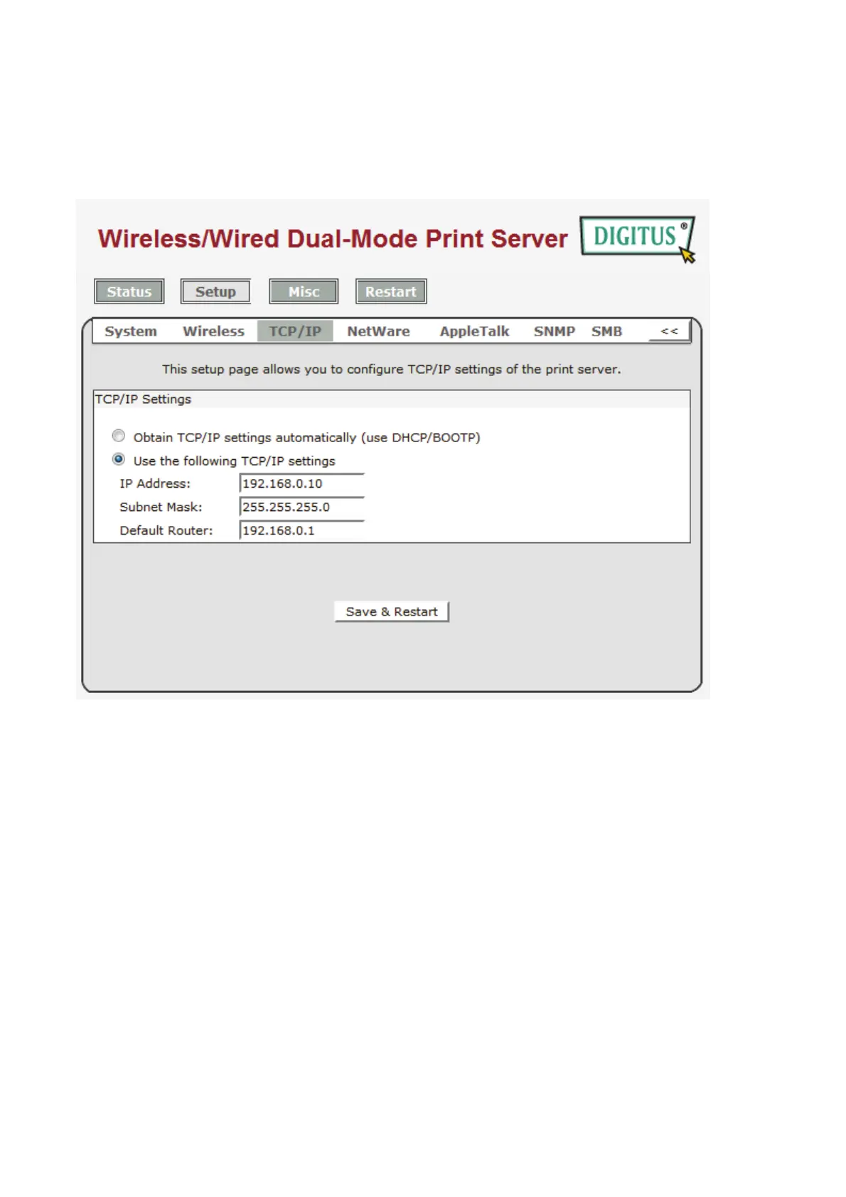 This option allows you to input gateway from the print server. This IP address of