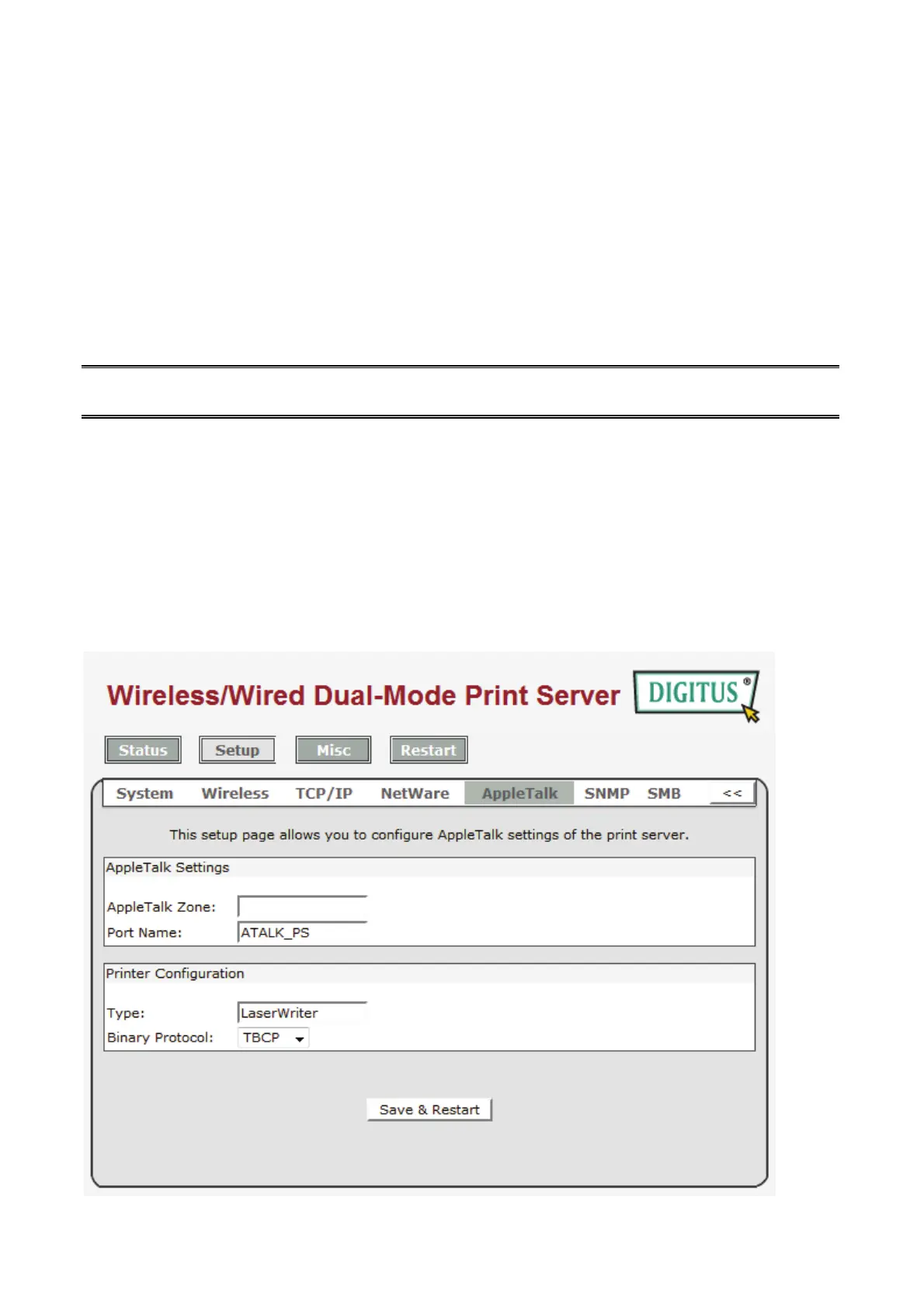Ethernet using AppleTalk protocol. The basic configuration is for the print server in an