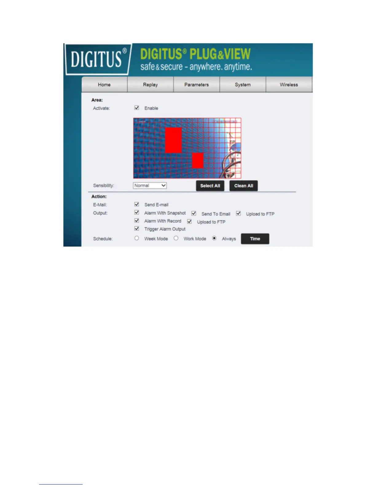 Ga naar "Parameters" -> "Motion Detect" via de webinterface.