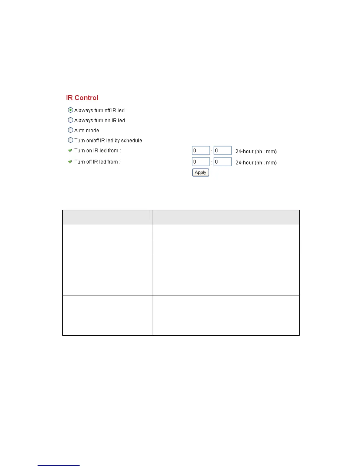 section, and end time in ‘Turn off IR led from’