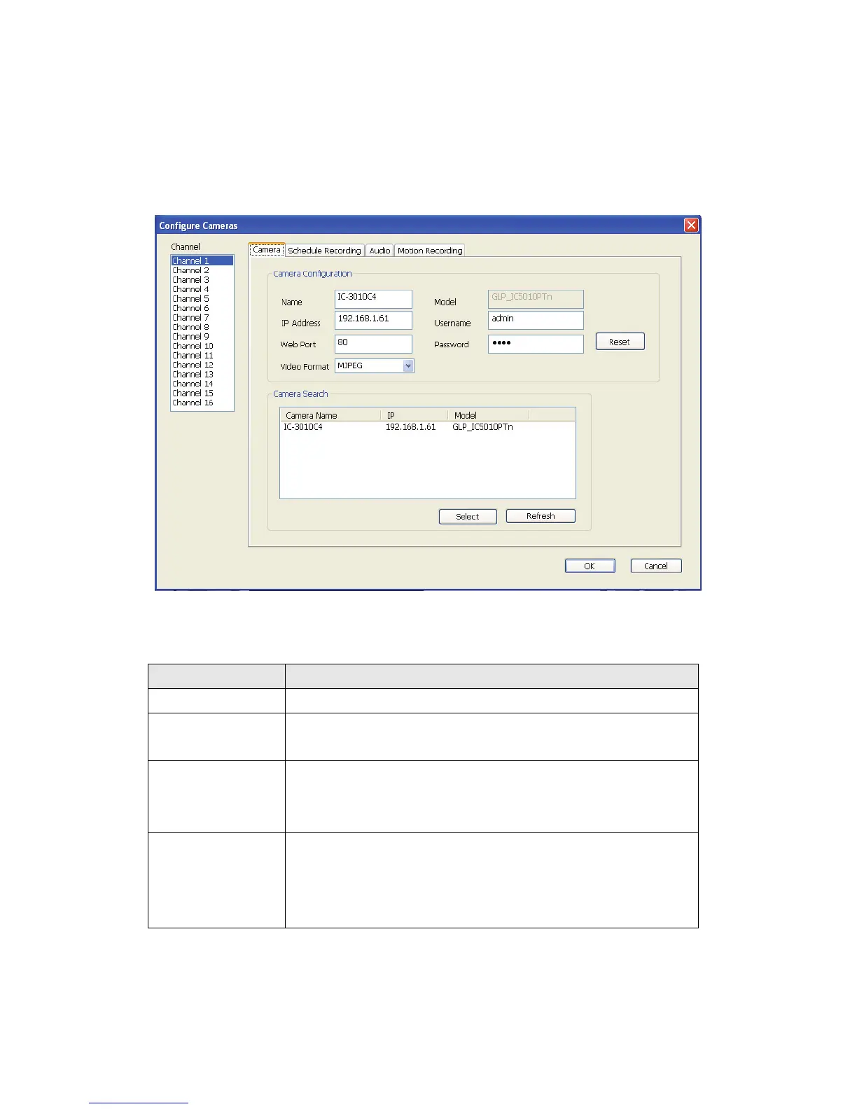 In this tab you can configure all cameras you wish to connect. Up to 16