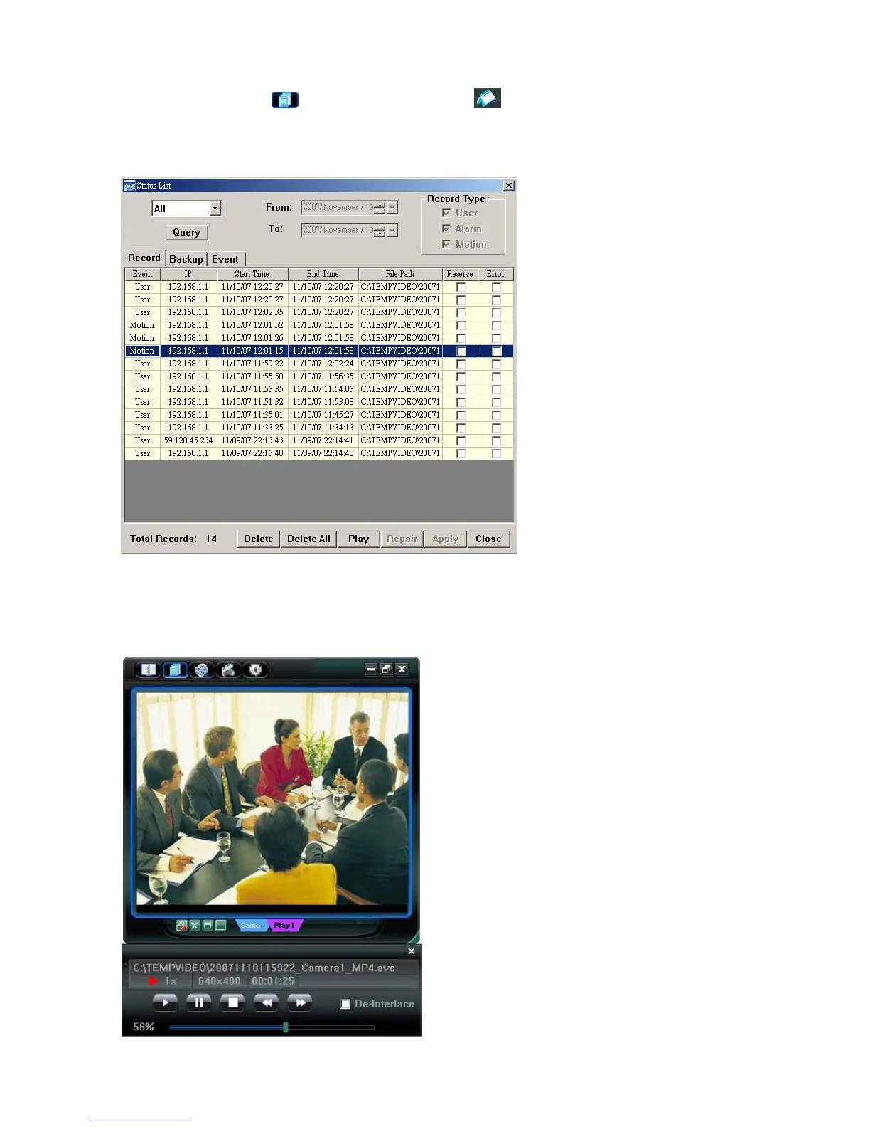 To play a recording, click “ ” (Miscellaneous Control) → “ ” (Status List), and select the “Record” tab. A list of
