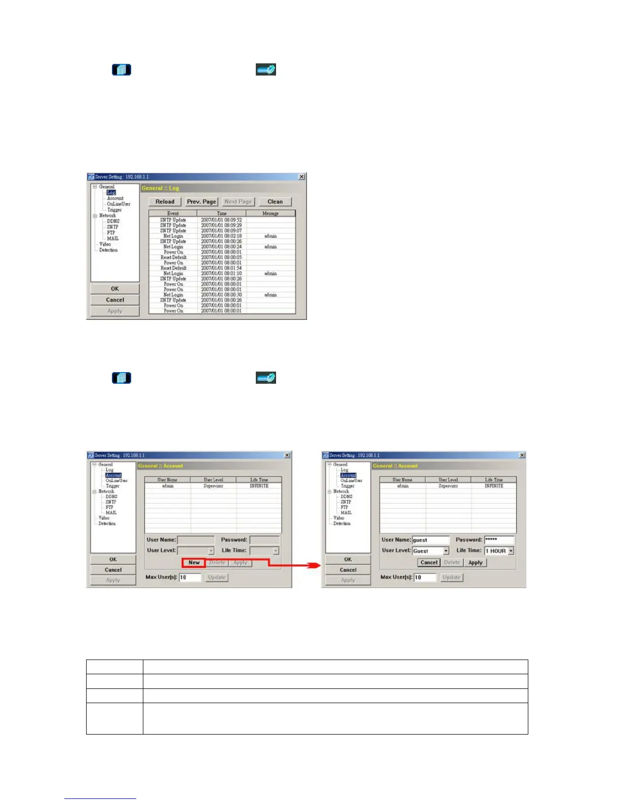 To add an account, click “New”, and set the “User Name”, “Password”, “User Level” and “Life Time”. Then, click