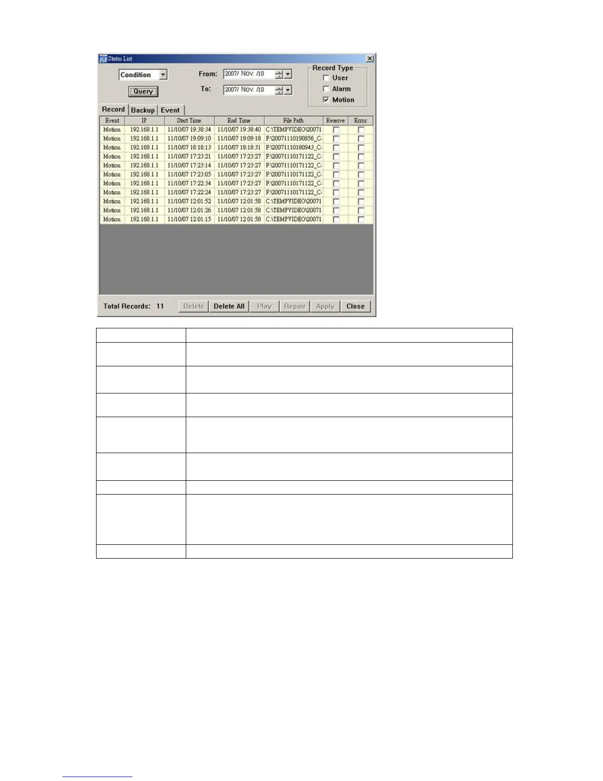 Play Click to play the selected record log. The playback panel will be shown for your further