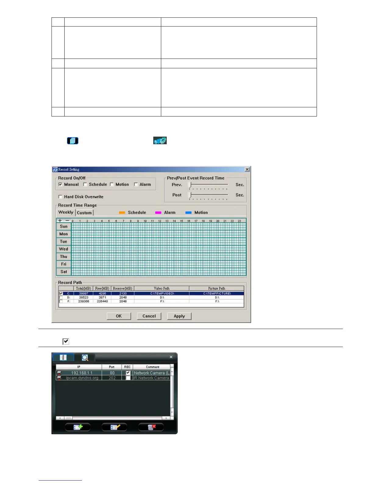 which type of the recording is enabled (Manual / Schedule / Motion / Alarm), and where the recorded data / snapshots