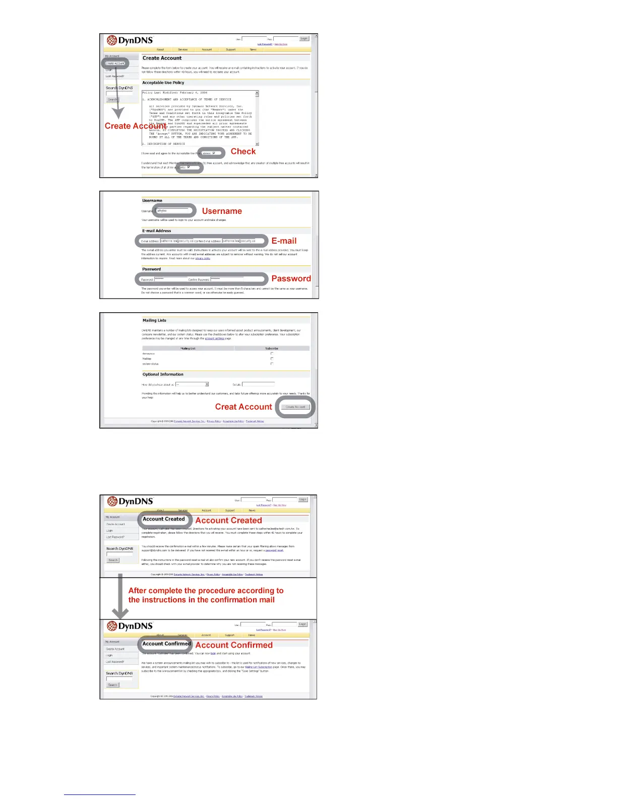 ‧ Then, you will see the screen “Account Created”, and Dyndns will email the instructions to your specified E-mail