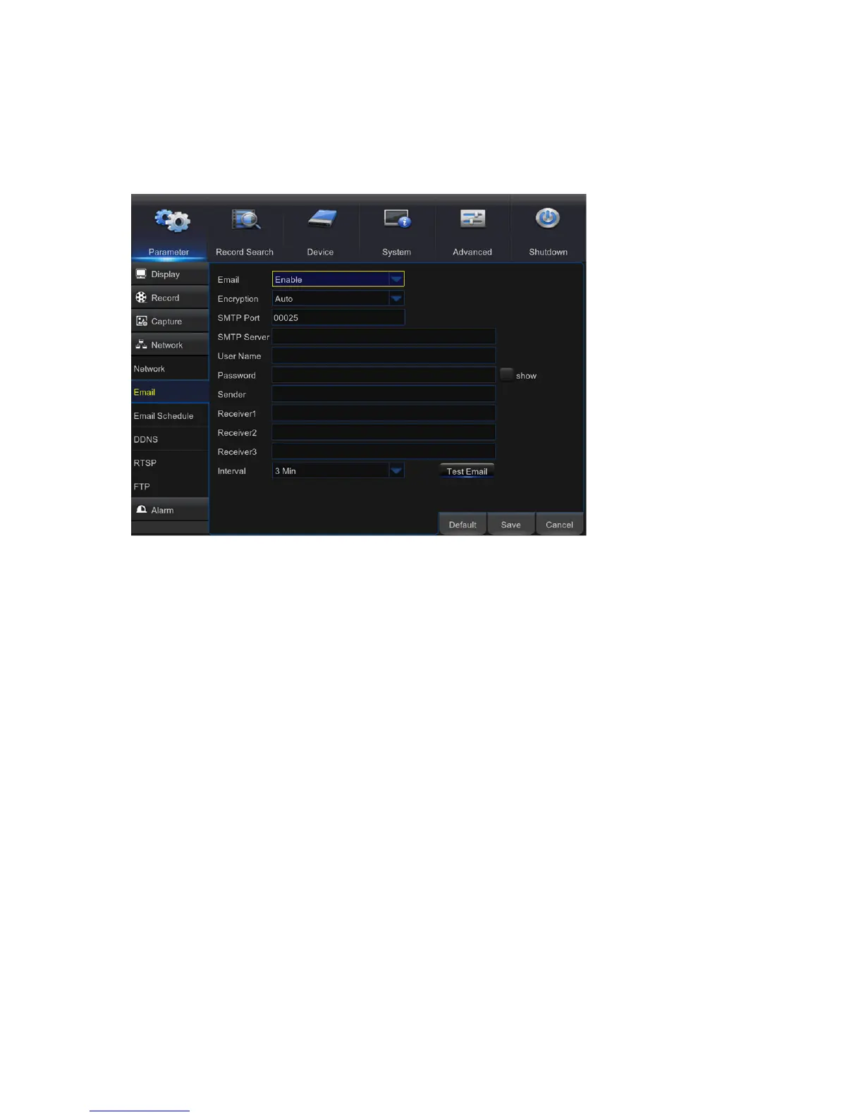Interval: Configure the length of the time interval between the notification emails from the DVR.