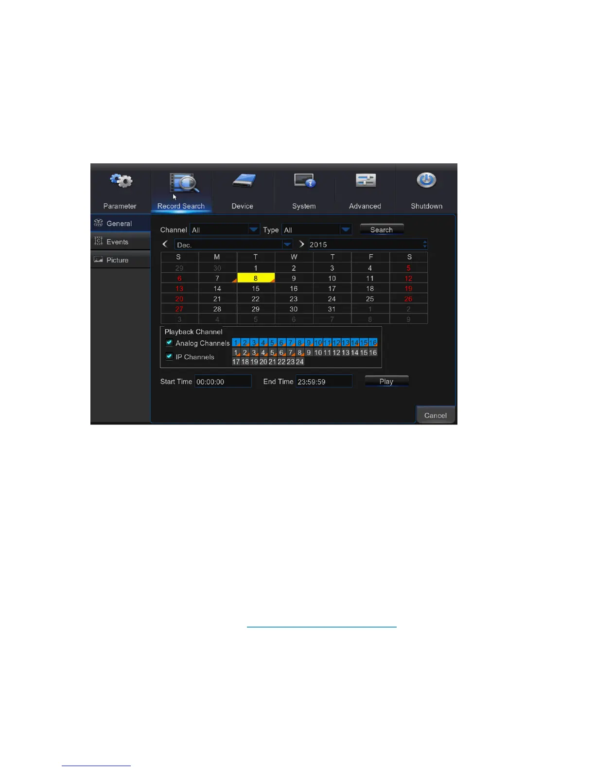 This section allows you to search and playback the recorded videos based on recording type,