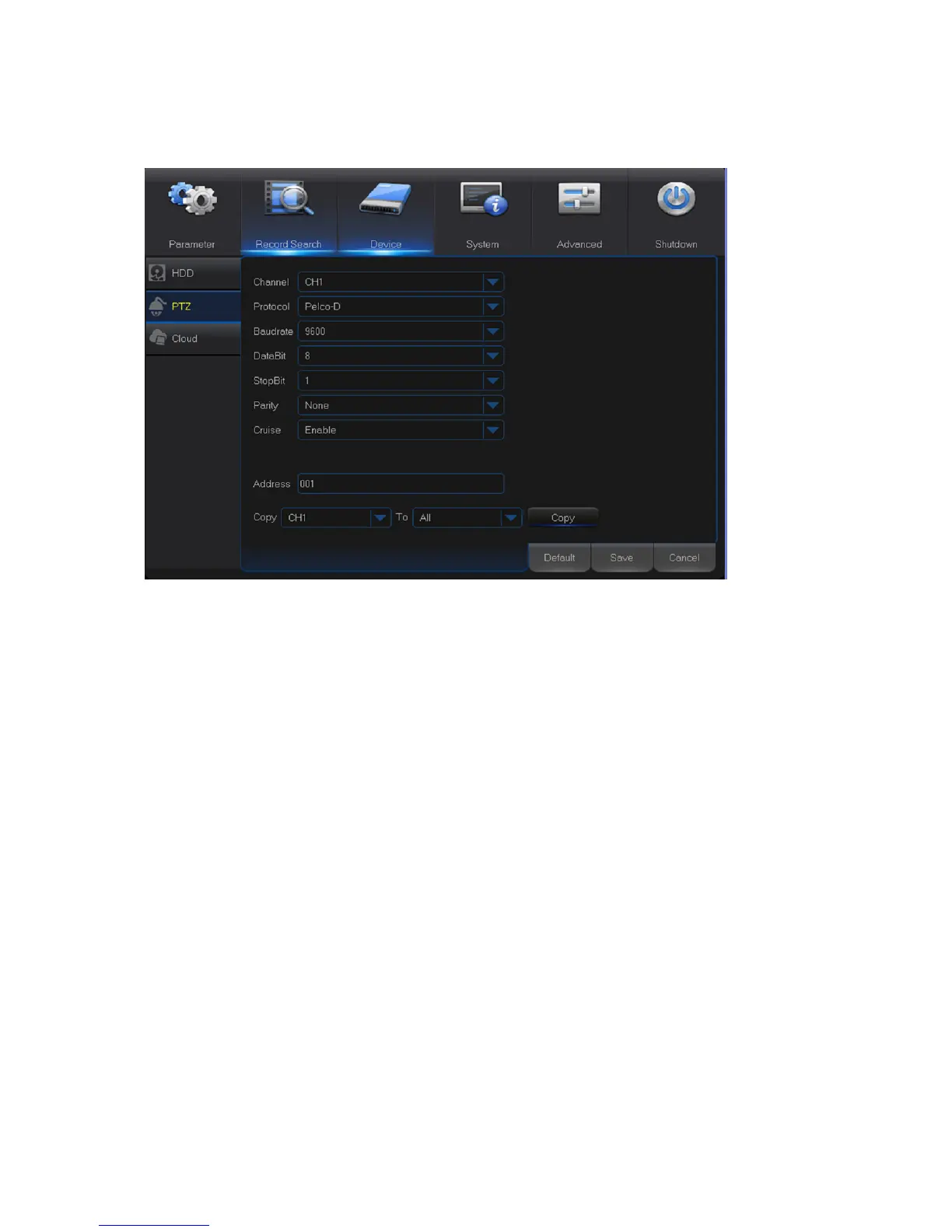 Address: Set the command address of the PTZ system. Please be noted that each PTZ-capable