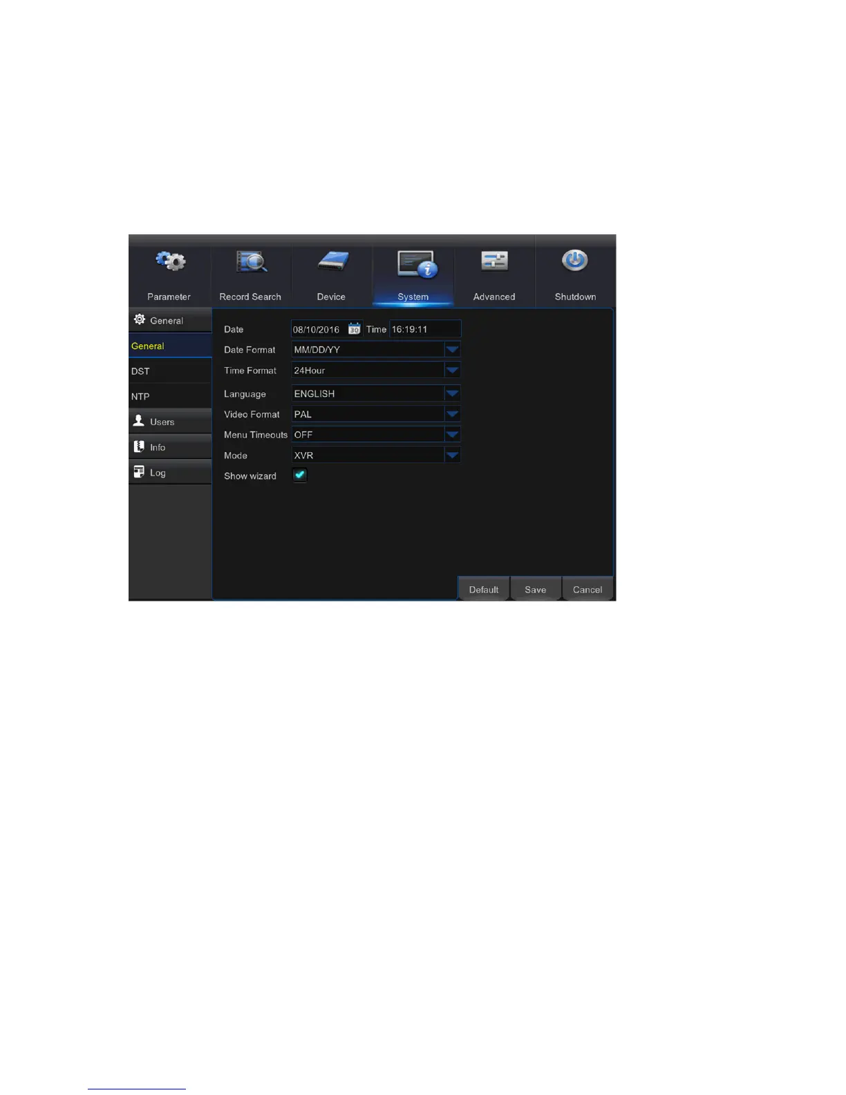 You are able to configure general parameters of the system, such as date and time, OSD