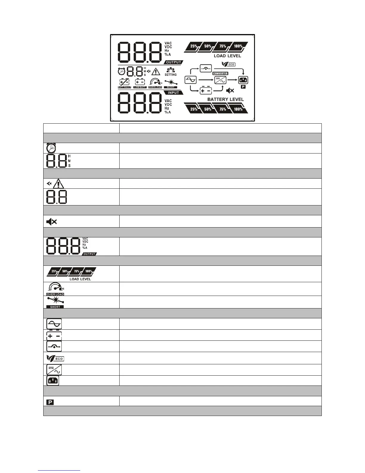 Indicates the output voltage, frequency or battery voltage.