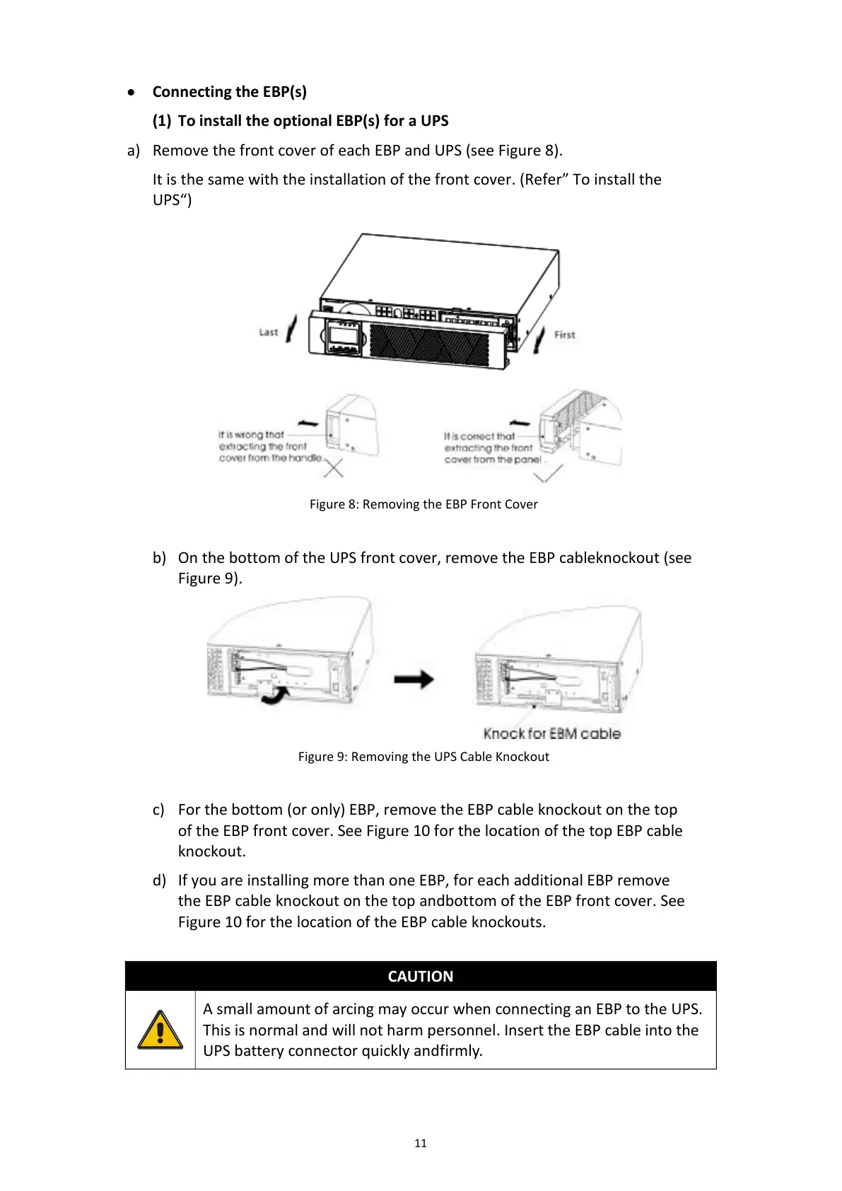 A small amount of arcing may occur when connecting an EBP to the UPS.