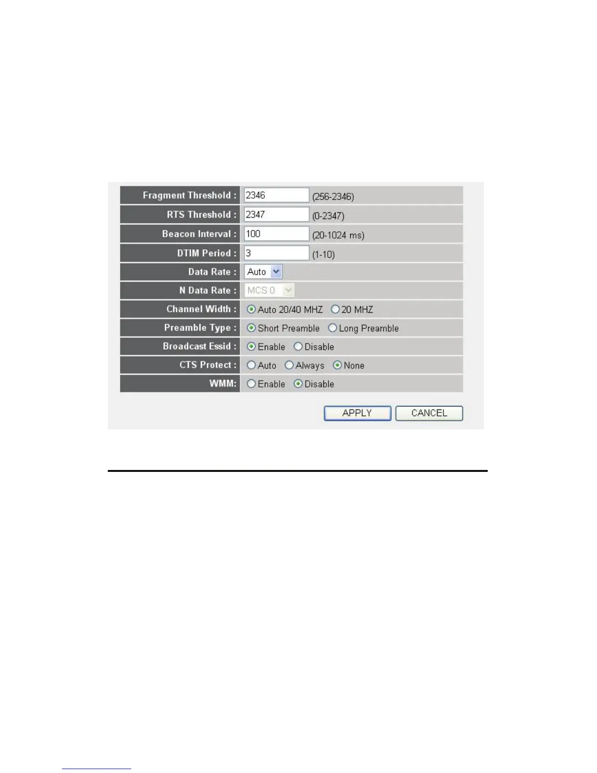 RTS Threshold (2): Set the RTS threshold of wireless radio. Do not modify
