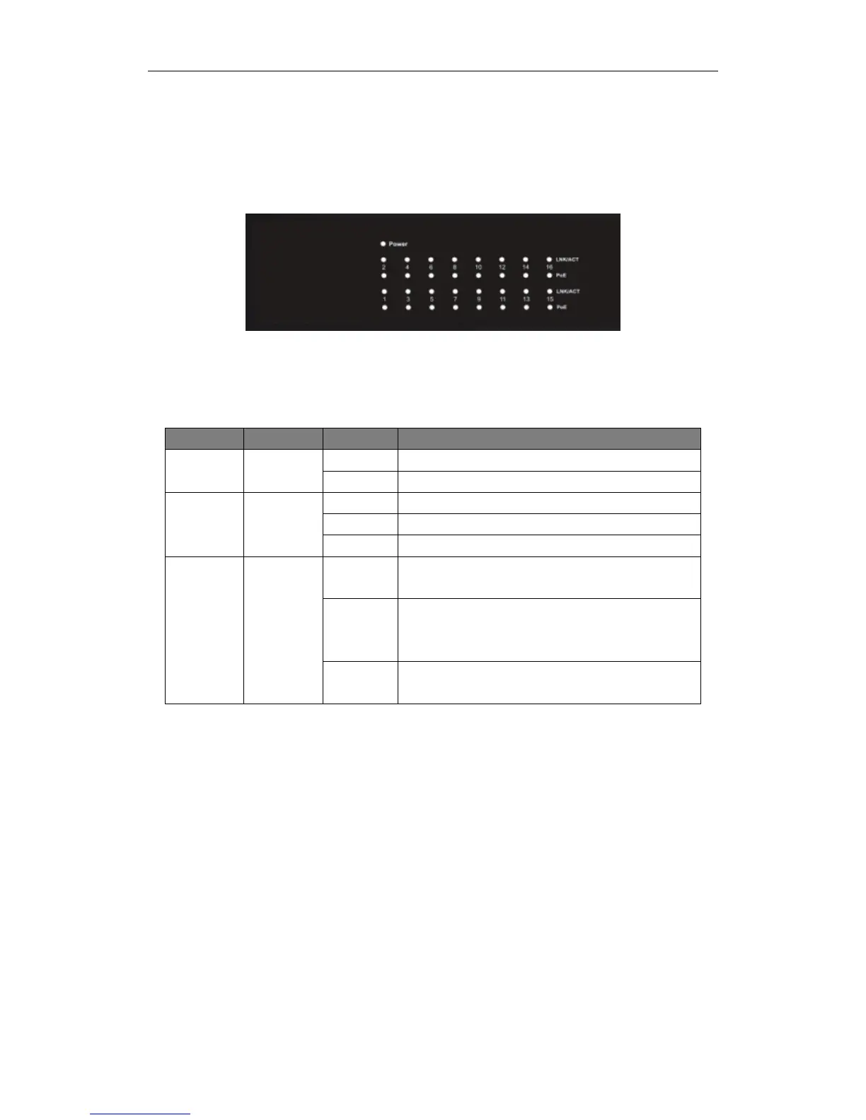 The following chart shows the LED indicators of the Switch along with explanation of each