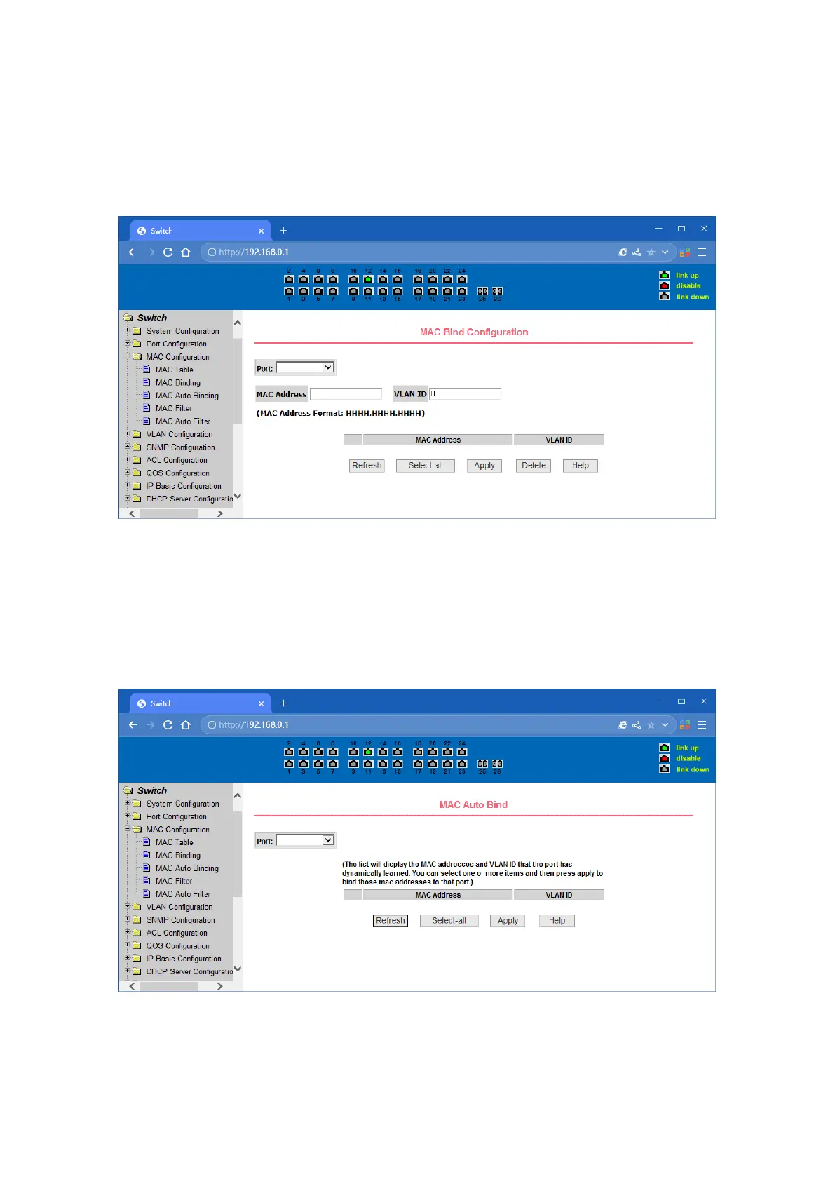 This page is used to achieve the port MAC address auto-binding. Shows the hardware switch on