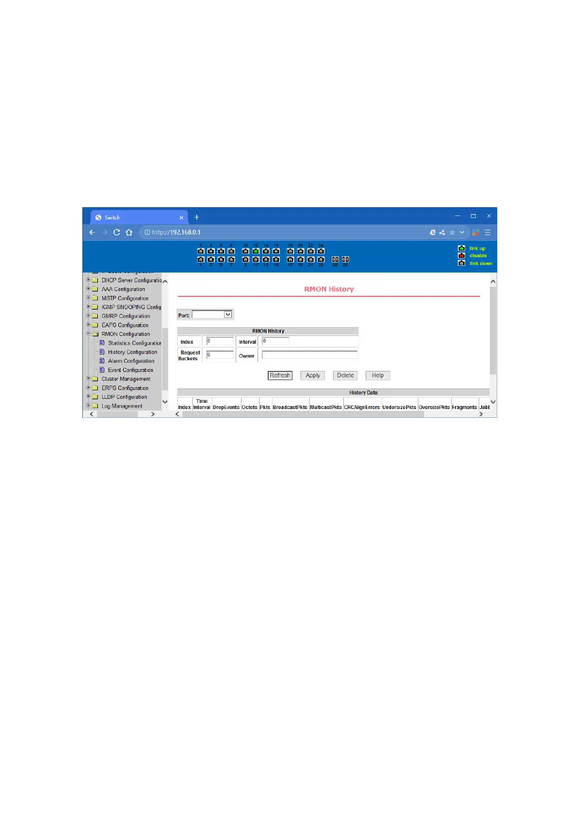 You can configure the RMON history group through this page. Select a port from the drop-down