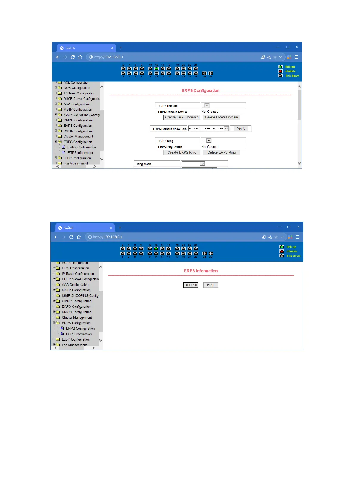 This is the ERPS information page, and the selected ring number displays the configuration and