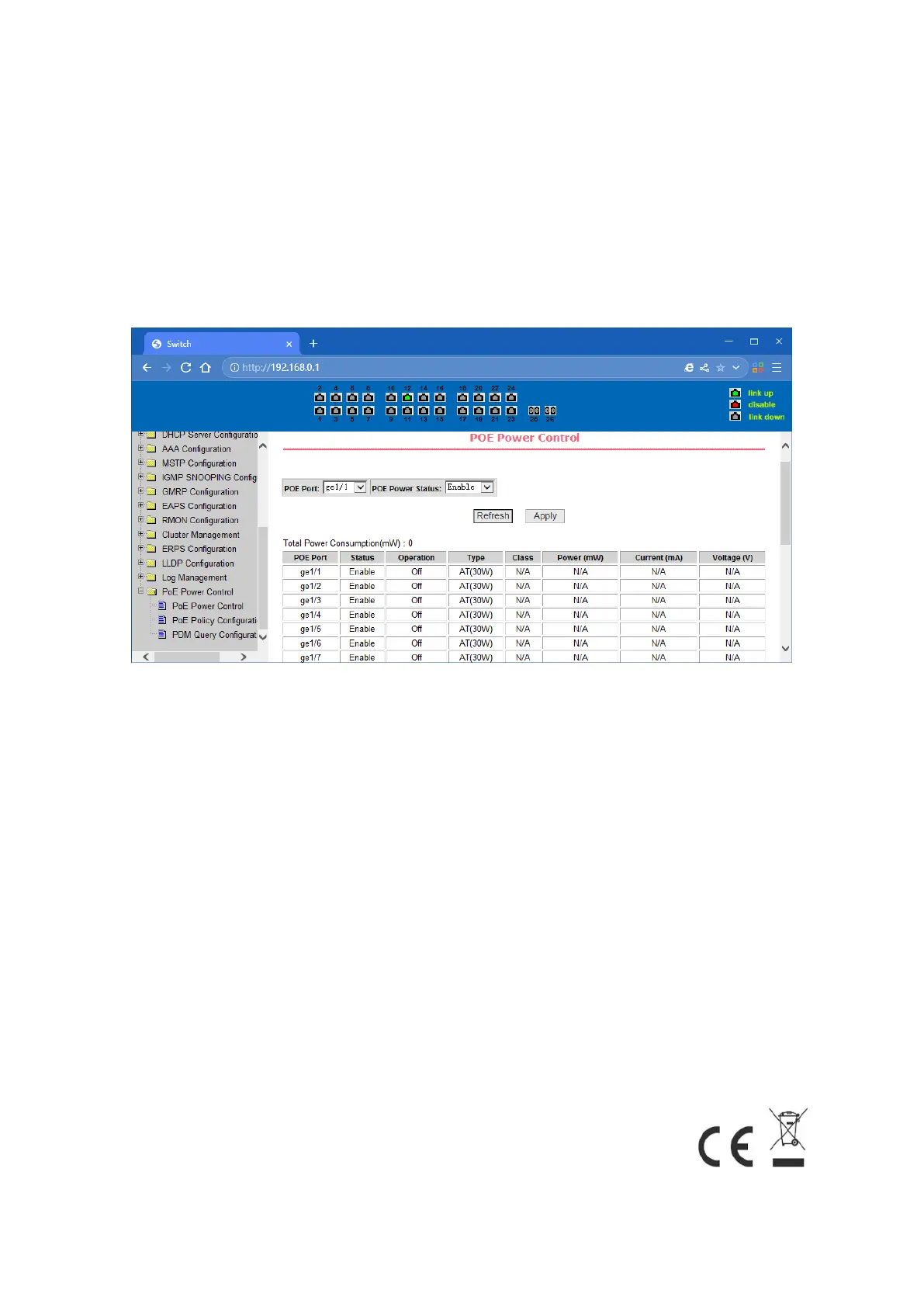 Status: Enable means PoE function is available;Disable means PoE function is close. 2,