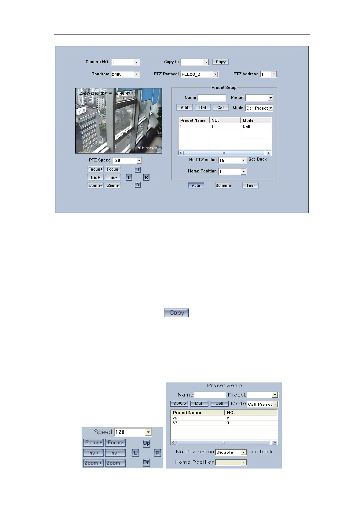 In this screen, you can define the PTZ protocol and set the Preset Position