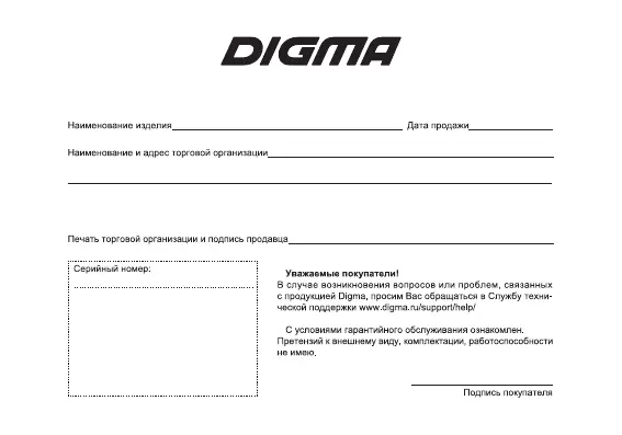 DIGMA DiVision 300 - Гарантийный Талон
