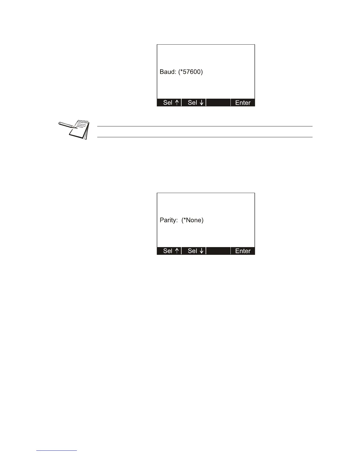 3. Select a baud rate using the Sel keys to scroll through the choices. Choices